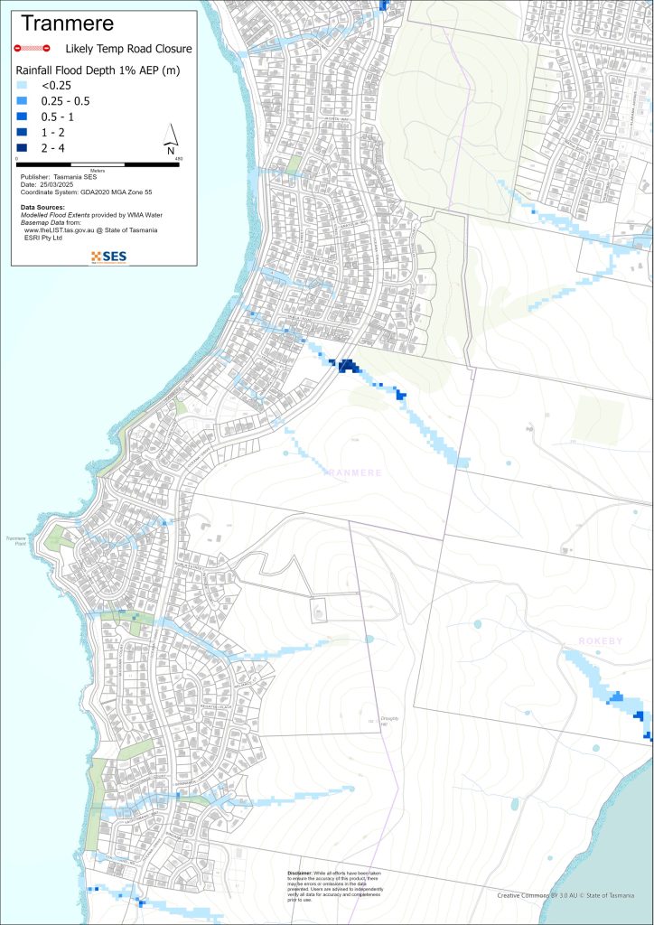 Even if your home is not inundated, you should prepare for isolation plus potential power and telecommunications outages. The Tasman Highway may be cut at Warrane and Mornington. Depending on where the rain falls and how heavy it is,